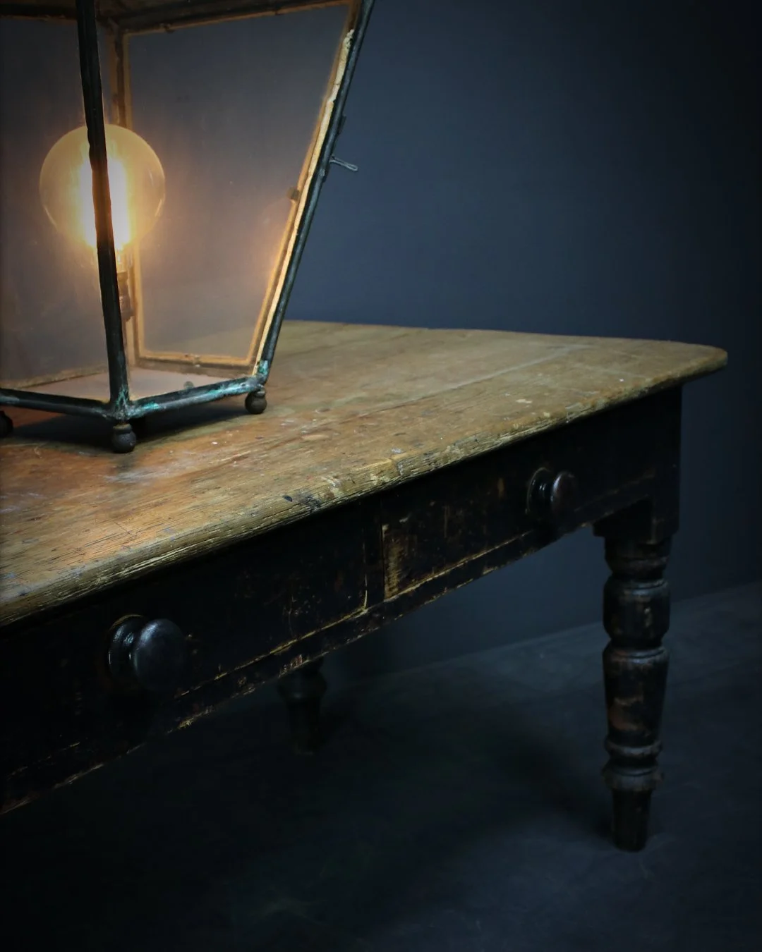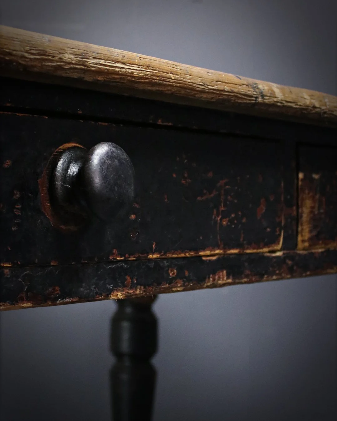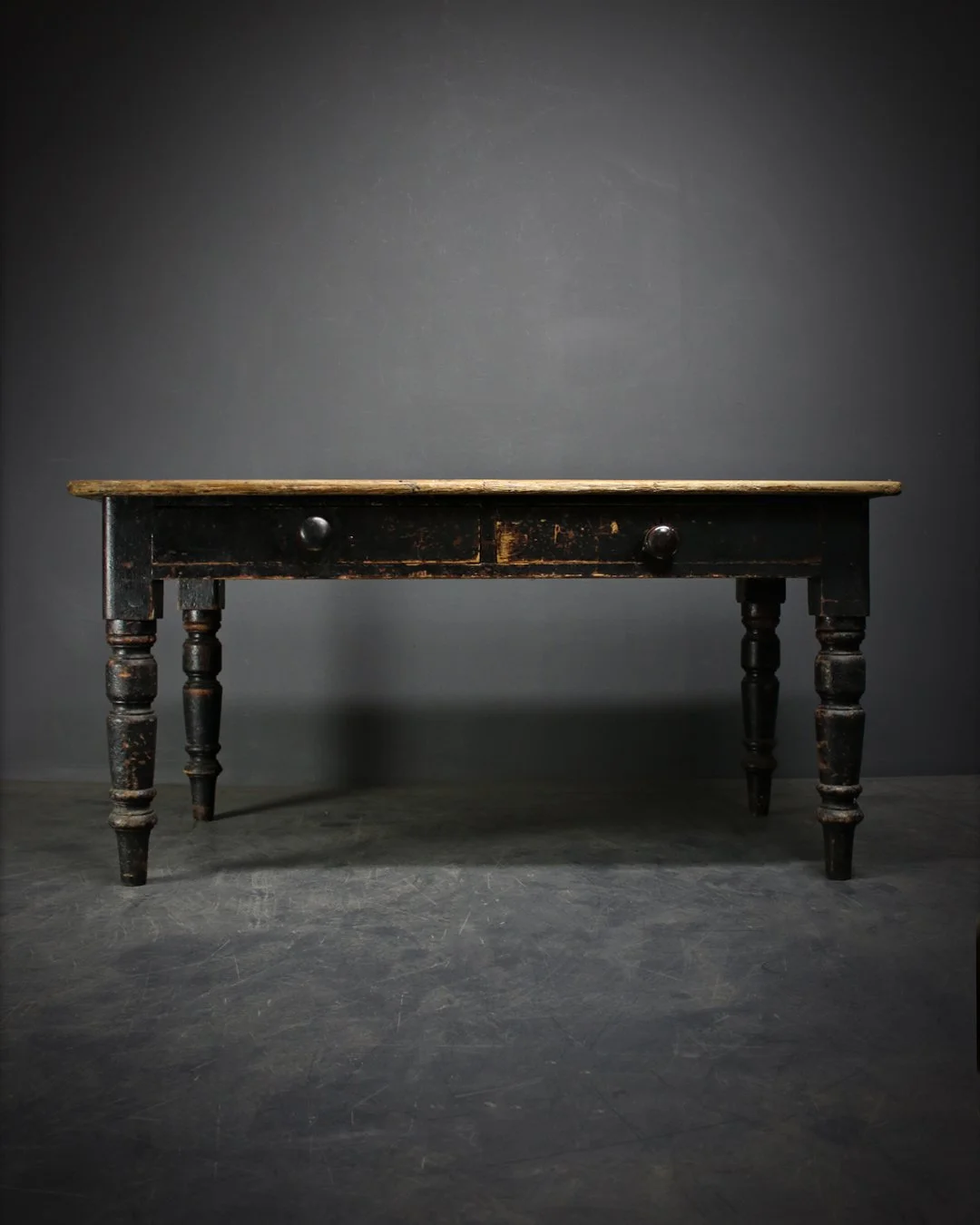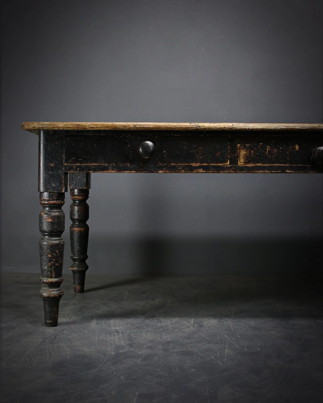 A very handsome country house kitchen preparation table of pine construction. A wonderful scrubbed top sits upon a beautifully weathered ebonised base with fine turned legs below 2 deep spacious drawers. Strong, sturdy and ready for work! English, c.1890.