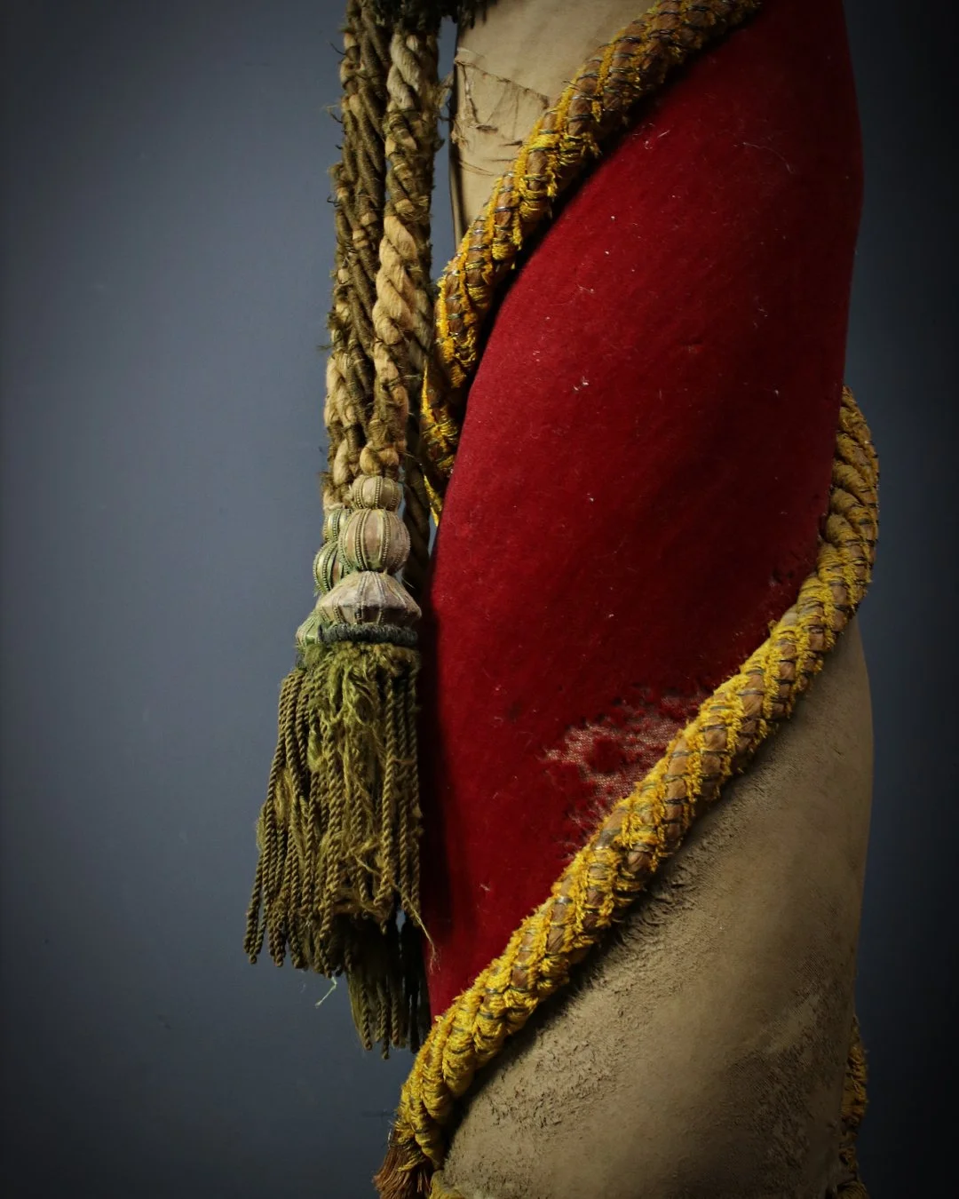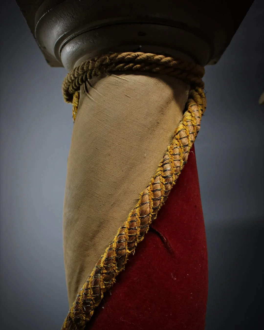 A superbly decorative pair of late 19th Century French painted pine column plinths, upholstered in red & cream velvet with elaborate tassel work. Original paint and structurally sound. General wear and tear commensurate with age.