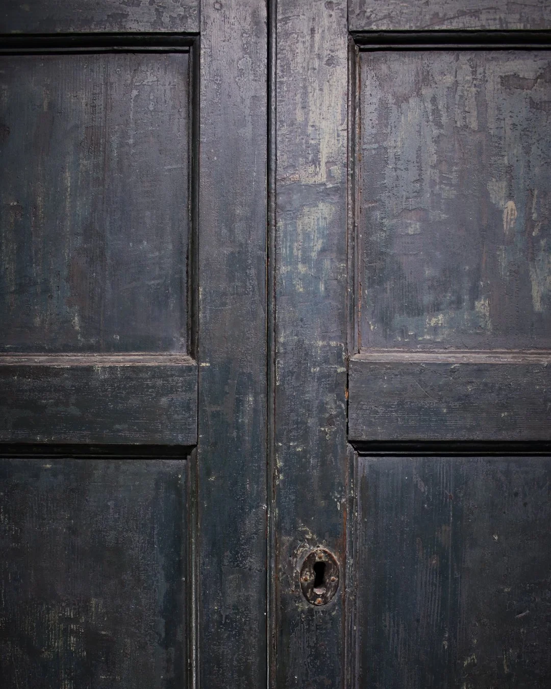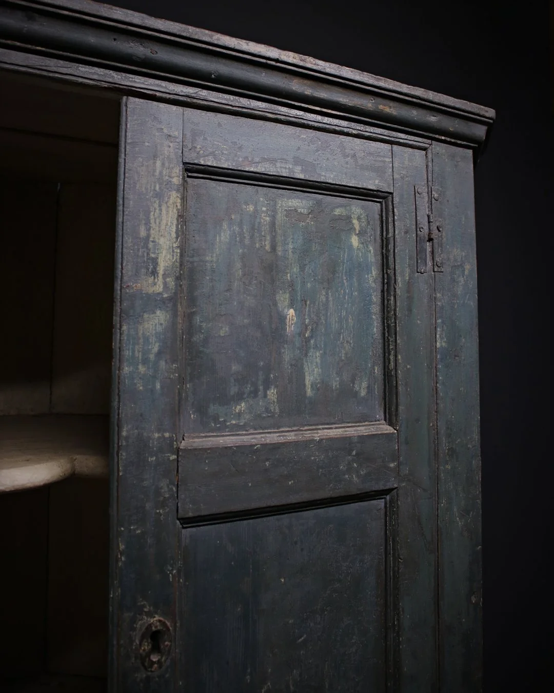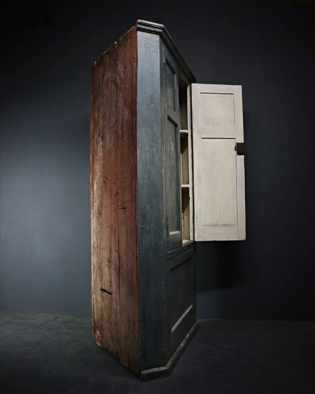 A fabulous English 19th Century Georgian pine corner cupboard of large scale and retaining its lovely original painted blue exterior with cream interior. The spacious interior top section revealing two shelves, the lower a single shelf. A superbly decorative original piece that provides a large amount of storage.