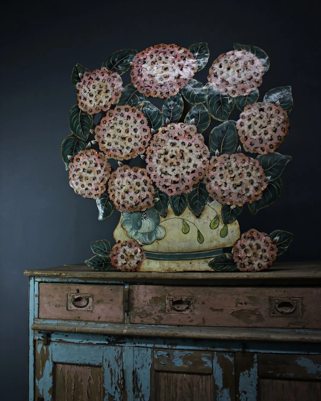 A delightful early 20th century hand-painted toleware fire guard of country house scale and depicting a beutiful floral arrangement of hydrangeas. Signed to lower right.English, c.1920.W: 86cm H: 84cmSOLD