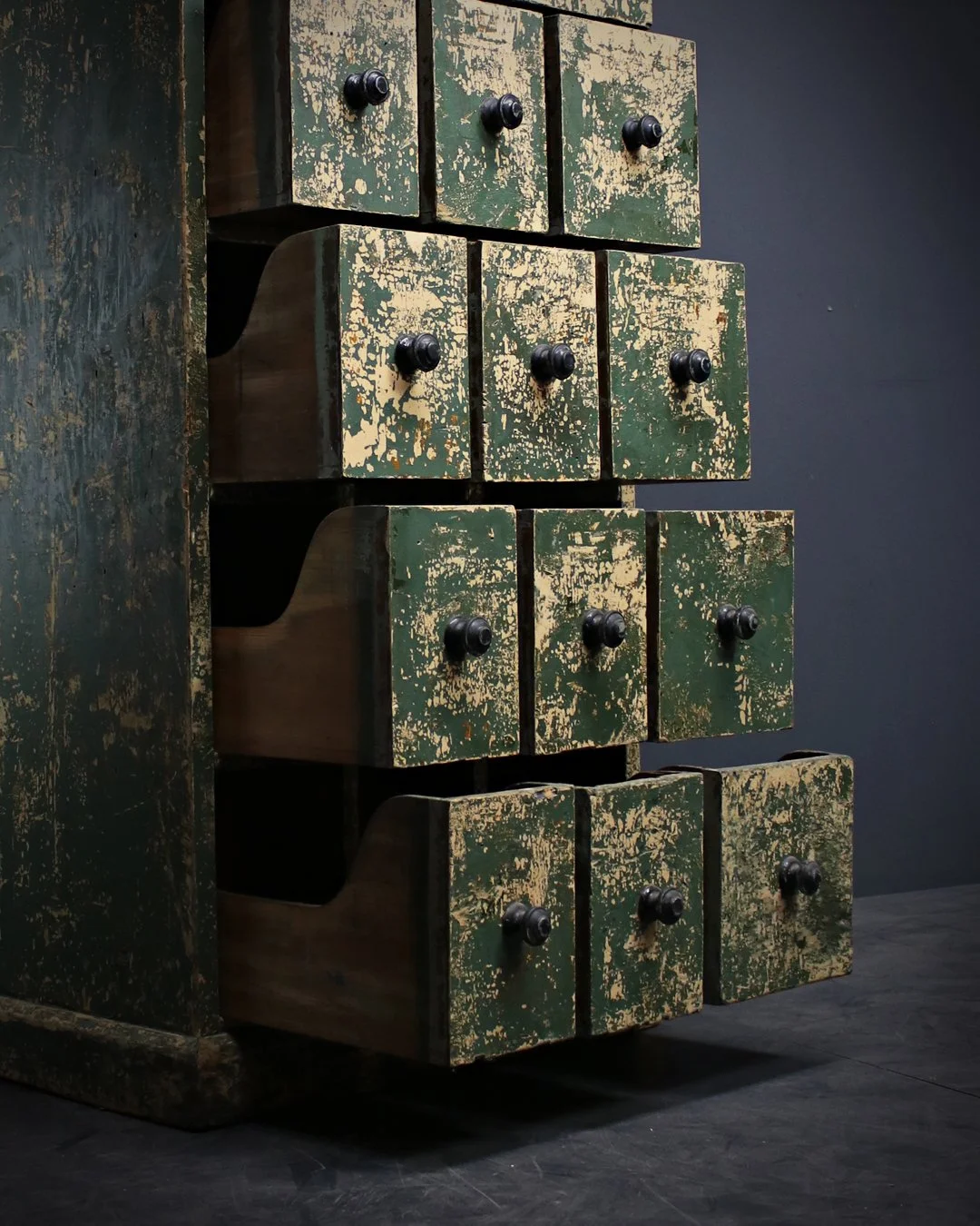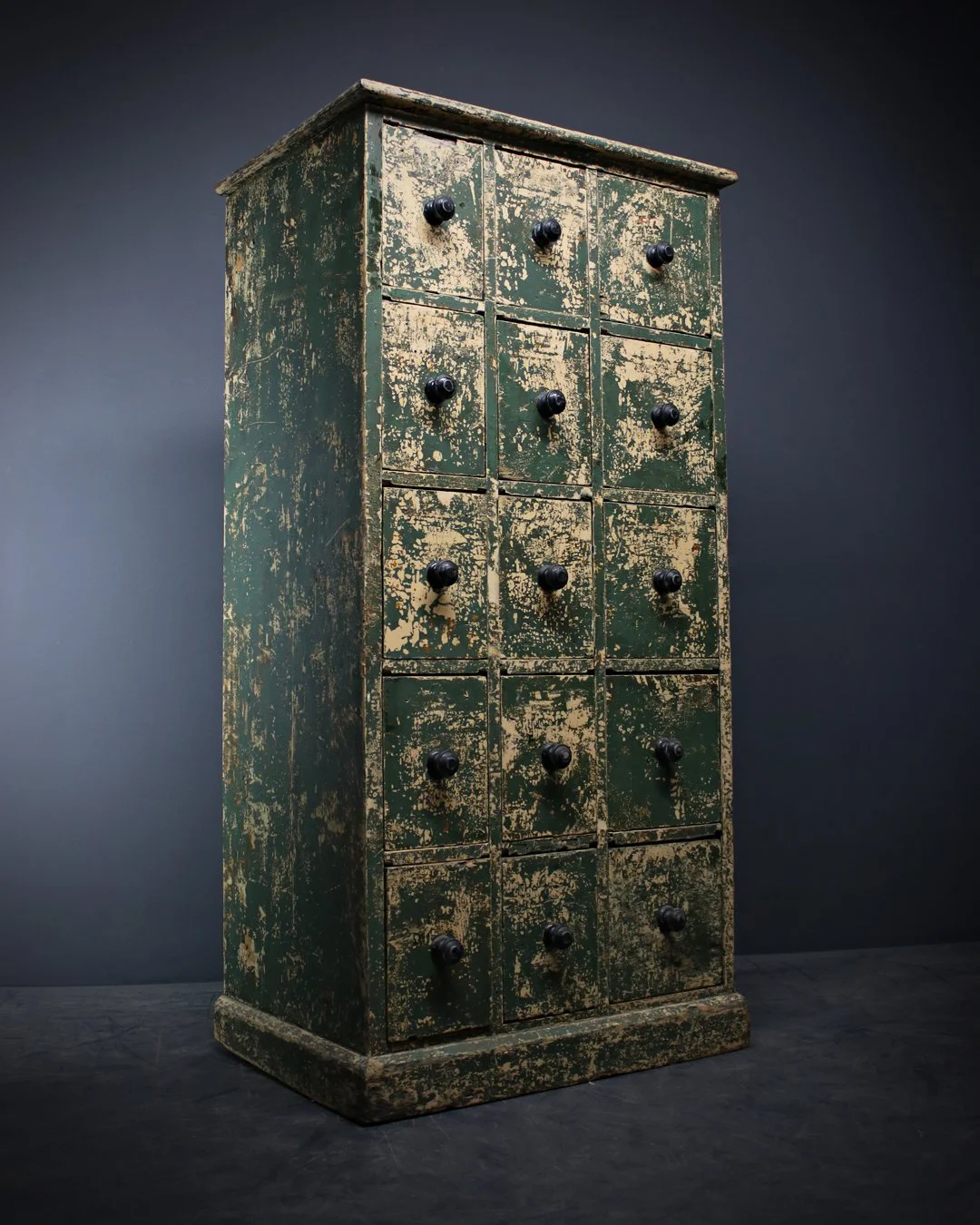 A Rustic Bank of 15 pine shop drawers in their lovely original condition - Colour and patina perfection! A vivid statement piece with character in abundance and at a very manageable, usable size. English, c.1900.W: 76cm H: 152cm D: 54cm£1095