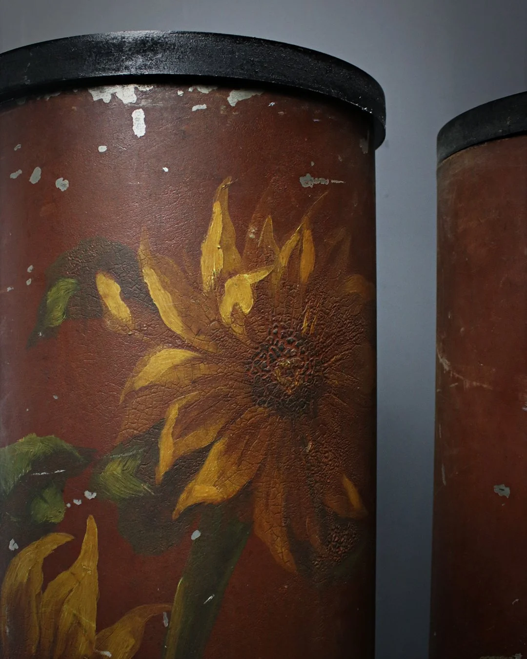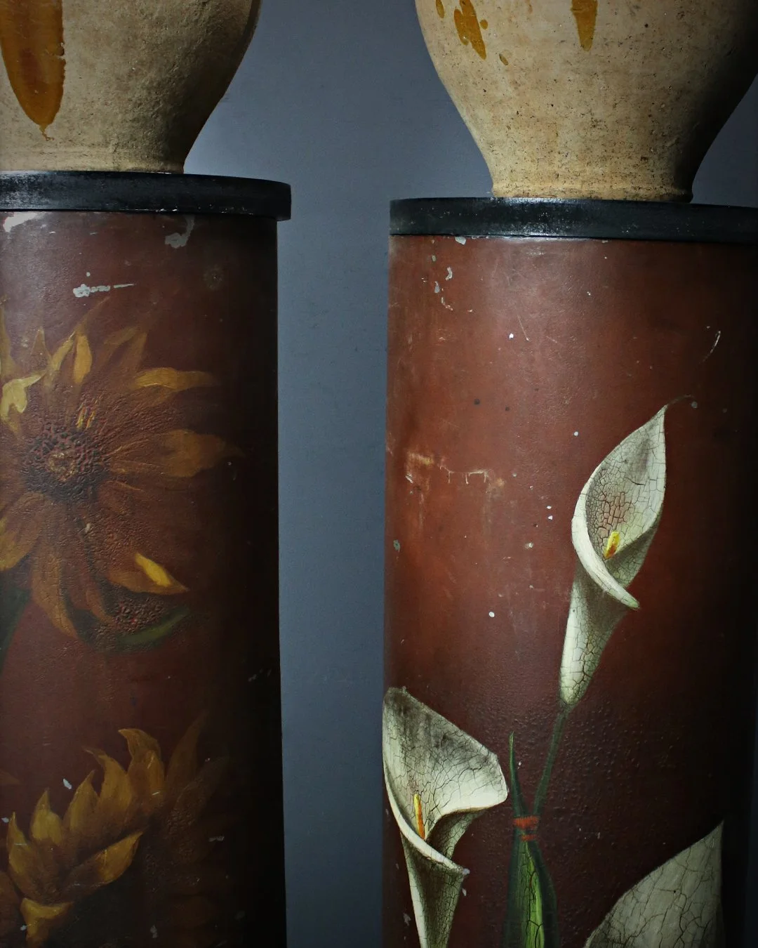 A very decorative pair of c.1920 painted zinc plinths. One painted with white Lillys (Calla), the other Sunflowers, the paint having developed some wonderful Craquelure patination over time. Later added wooden plinth tops.