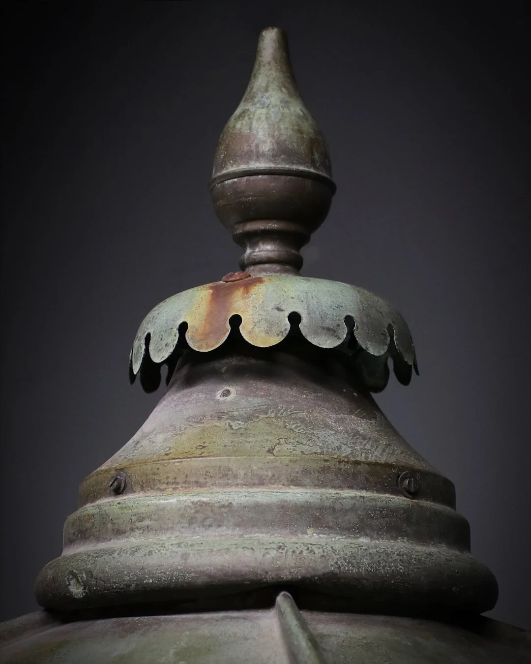 Wonderful natural verdigris to this early 20th century copper street lantern, converted to electric and for use as a statement table lamp. English, c.1920.W: 46cm H: 86cm D: 46cm£625