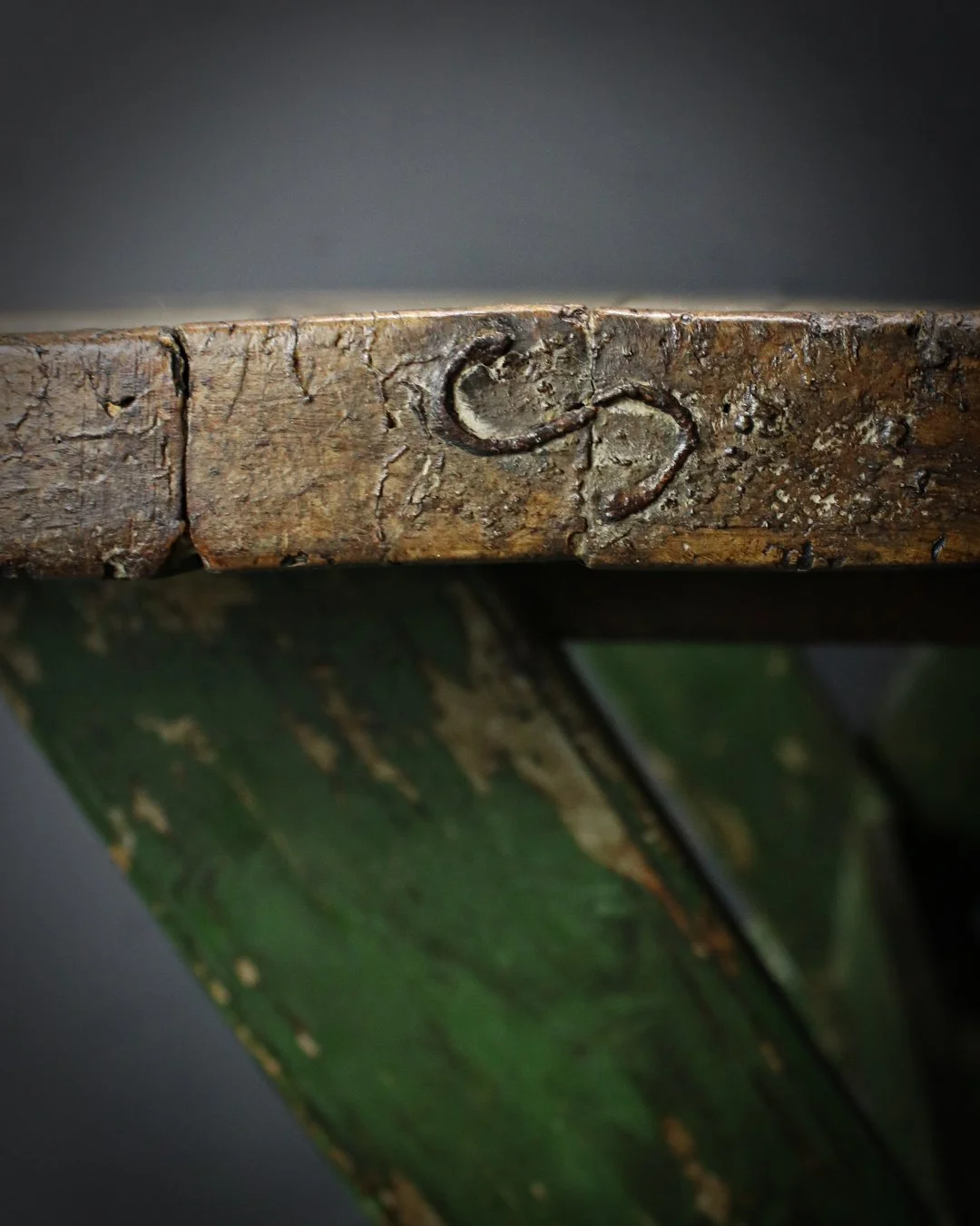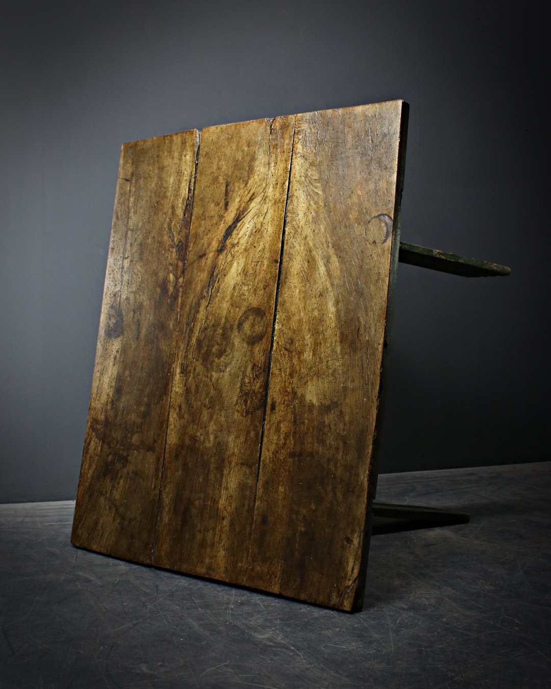 A classic vernacular X frame tavern table with a three plank scrub top and central metal stretcher bridging the pine X frame which wears it’s original green Painted Surface. A beautiful table! English, c.1850W: 95cm H: 75cm D: 75cm £695