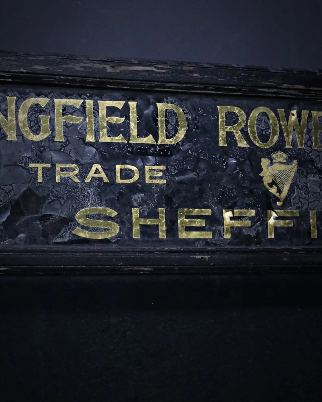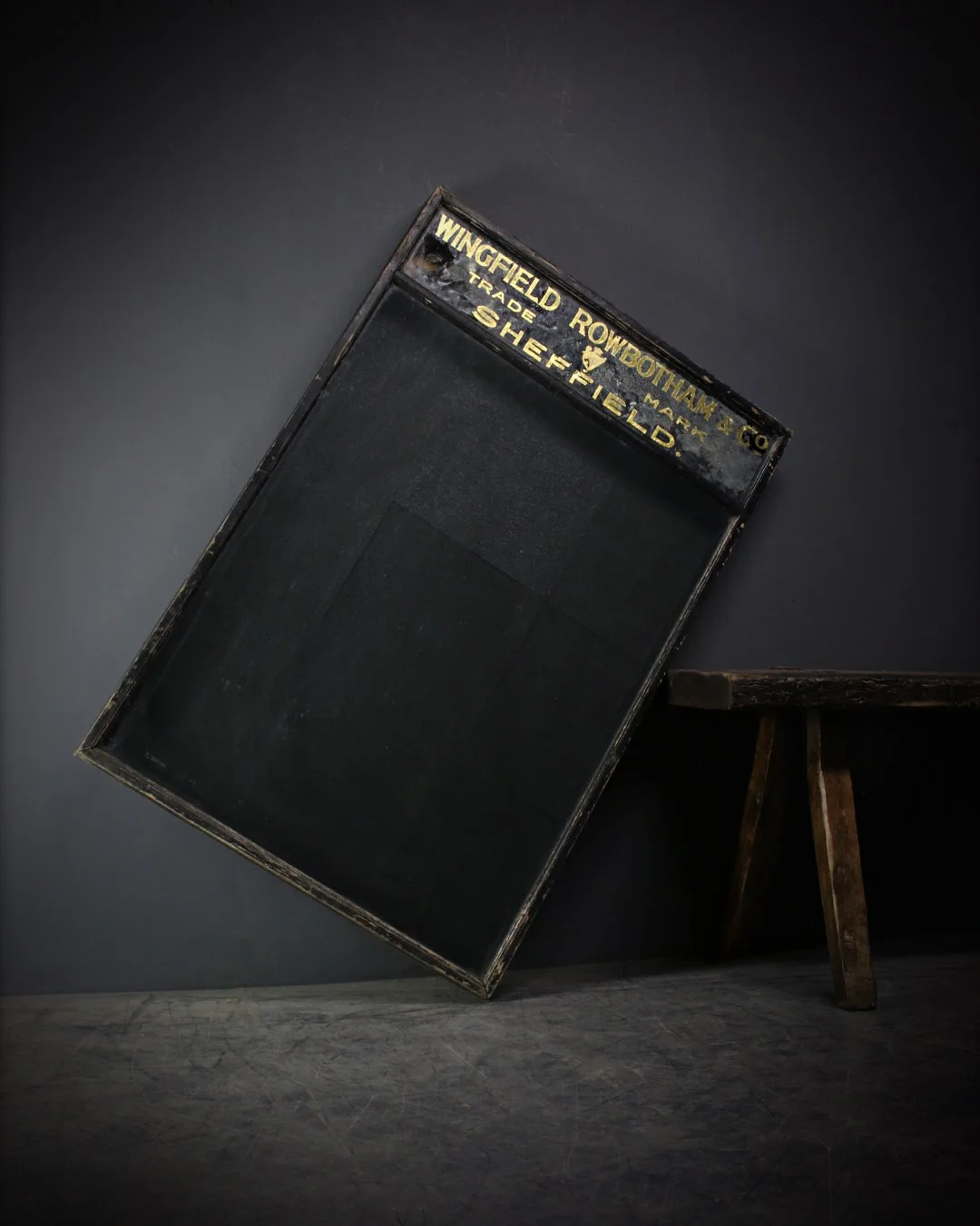 A wonderfull large scale notice board for the renowned Sheffield steel cutlery makers ‘Wingfield Robotham & Co” with a beautiful reverse painted glass header board that sits above a glazed section. The glazed sections back panel unscrews to reveal a corked backboard to which notices were applied. A beautiful piece that would have sat proudly outside the head offices, Tenter street, Sheffield. English, c.1880.
